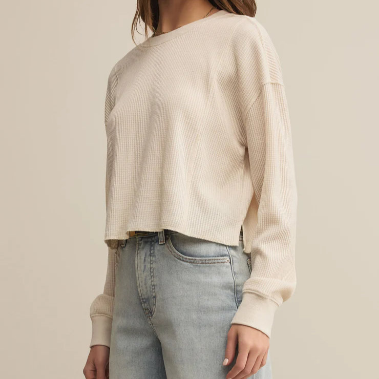 Easy, breathable, and just the right amount of relaxed. This mineral-washed, cropped thermal features soft waffle knit and subtle seaming details that elevate your everyday rotation.