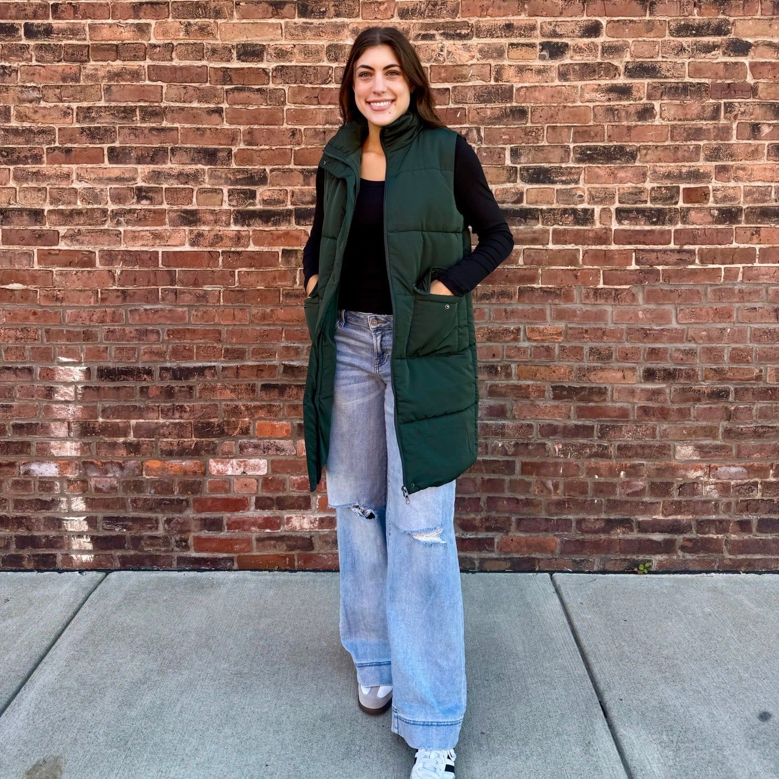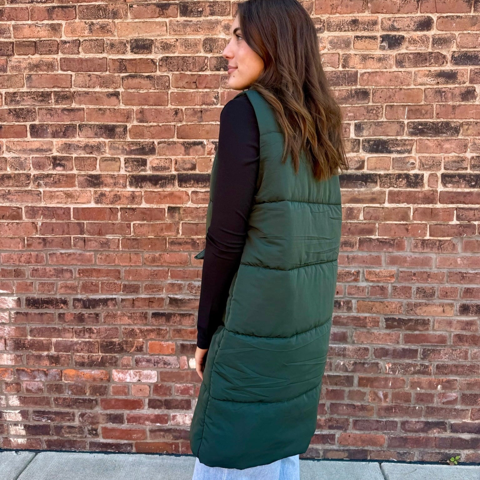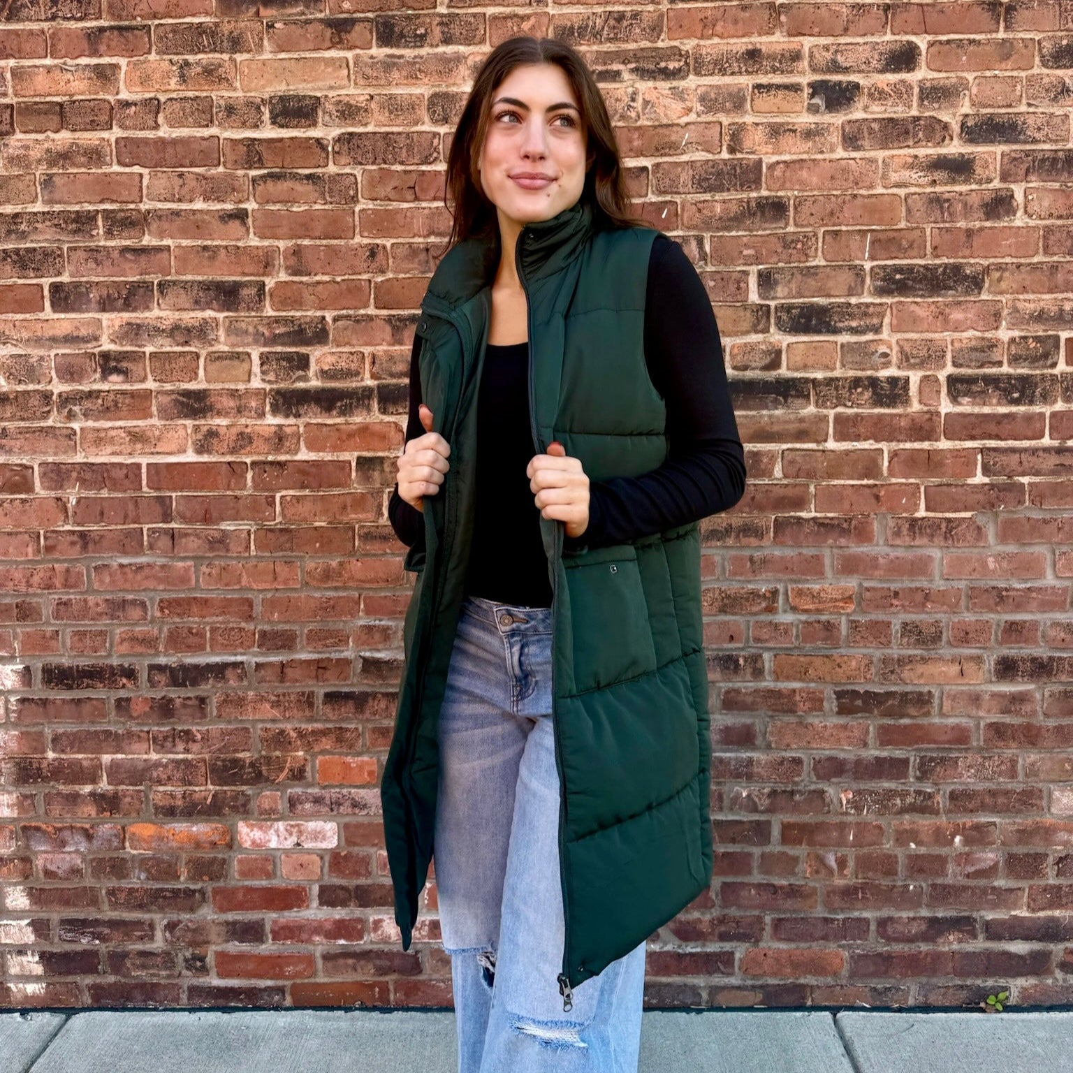 Dark Green Long Puffer Vest. Zipper & snap closure on the front. Two side pockets.  50% Nylon / 50% Polyester. For length reference, Emily is 5'8"