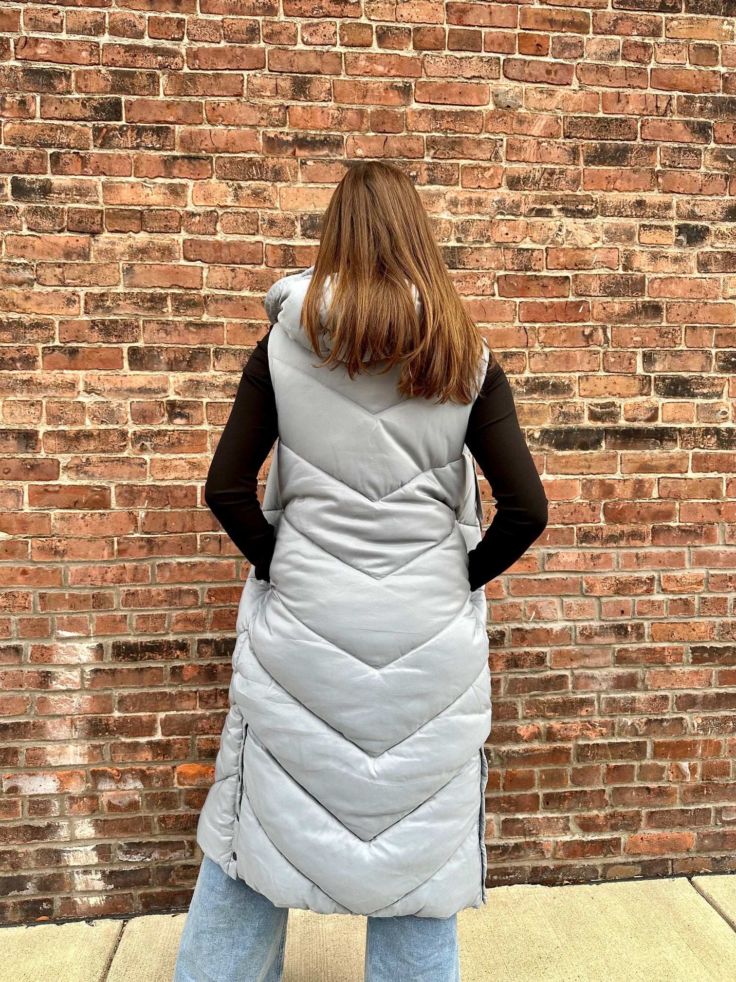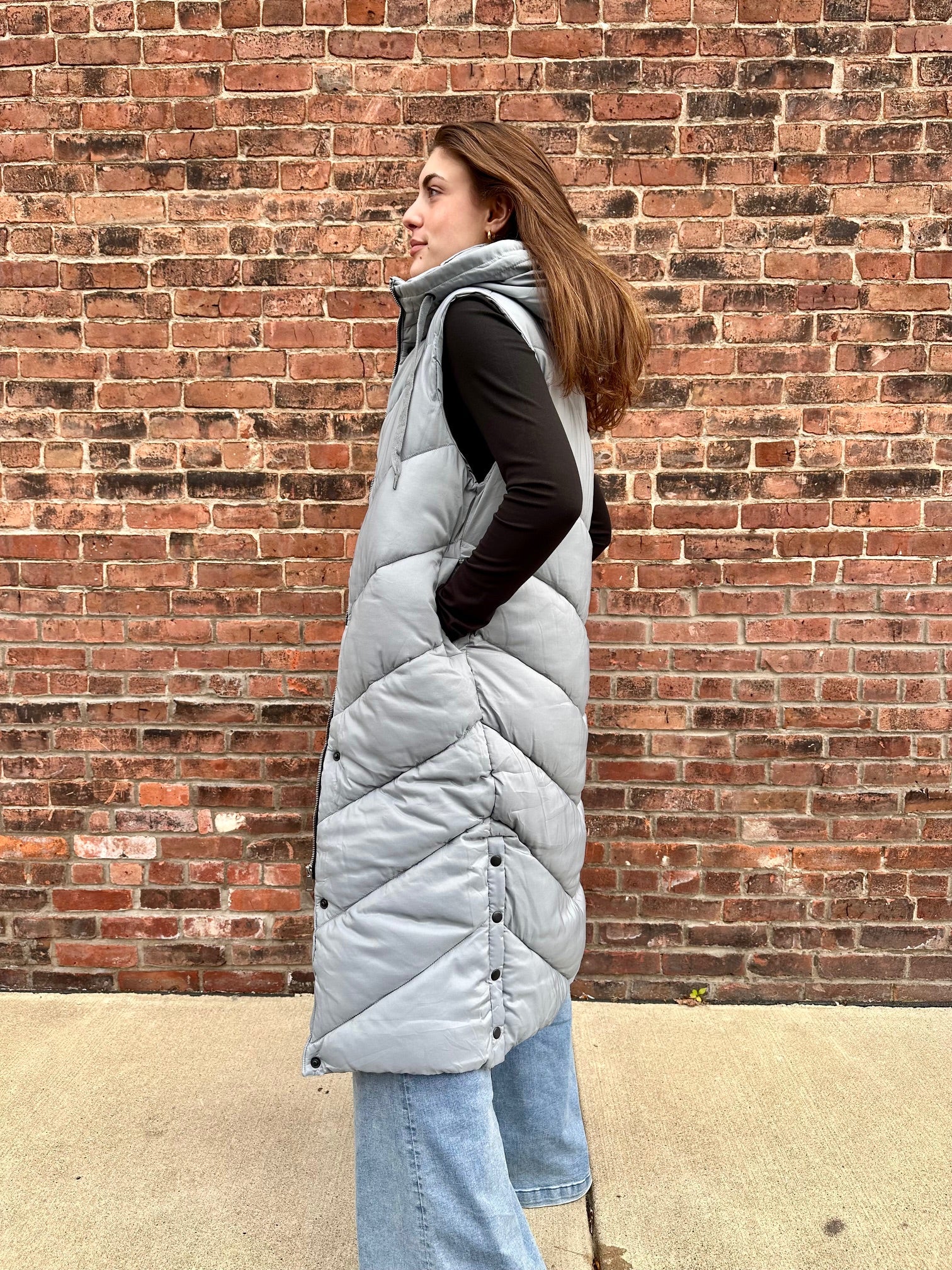 Hooded longline padded vest with mock neckline. Functional drawstring hood. Zip and button closure with side button detail. Side pockets. Approximate Length: 42'' / 107cm. 100% Polyester.