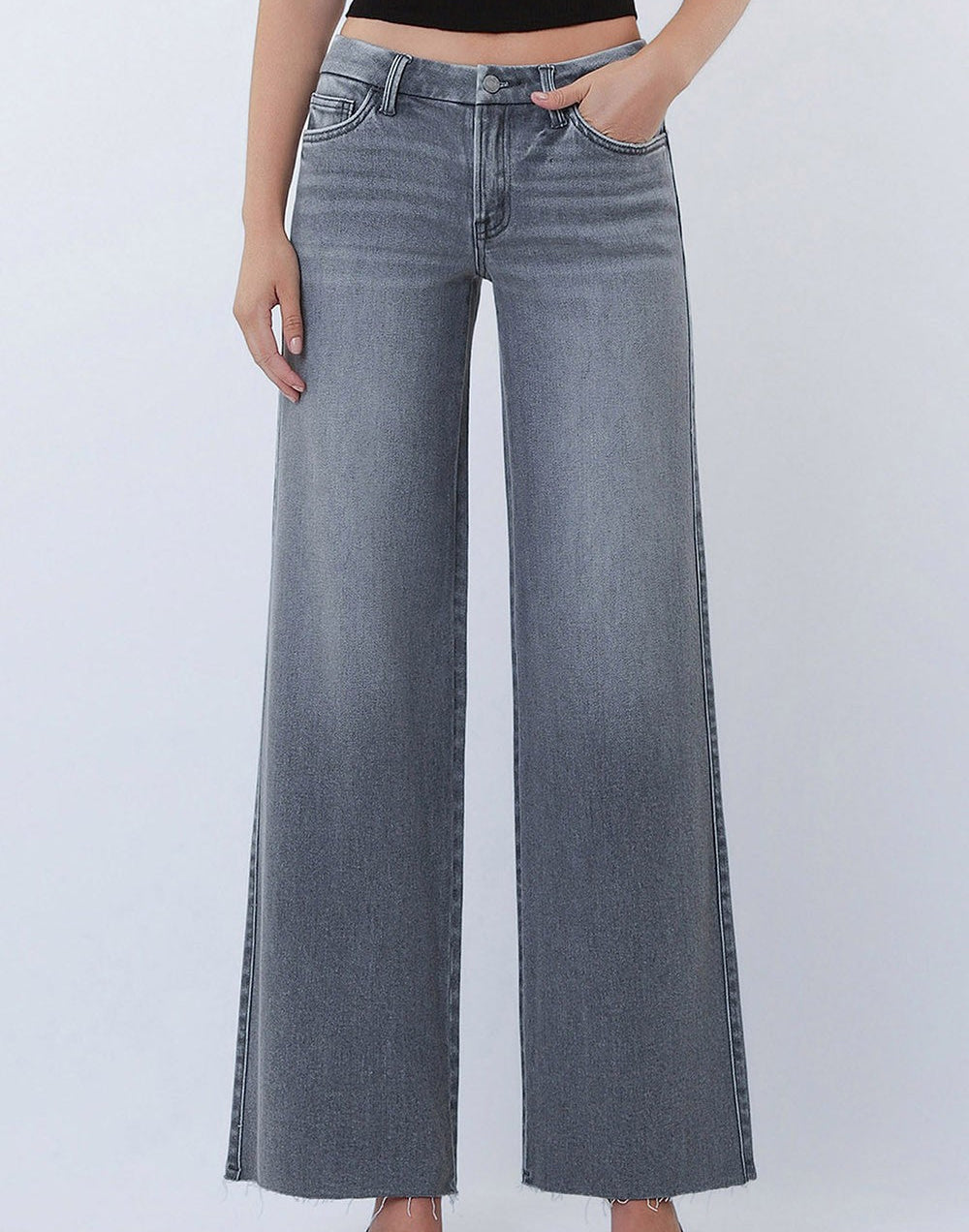 Grey Mid Rise Raw Hem Wide Leg Jeans