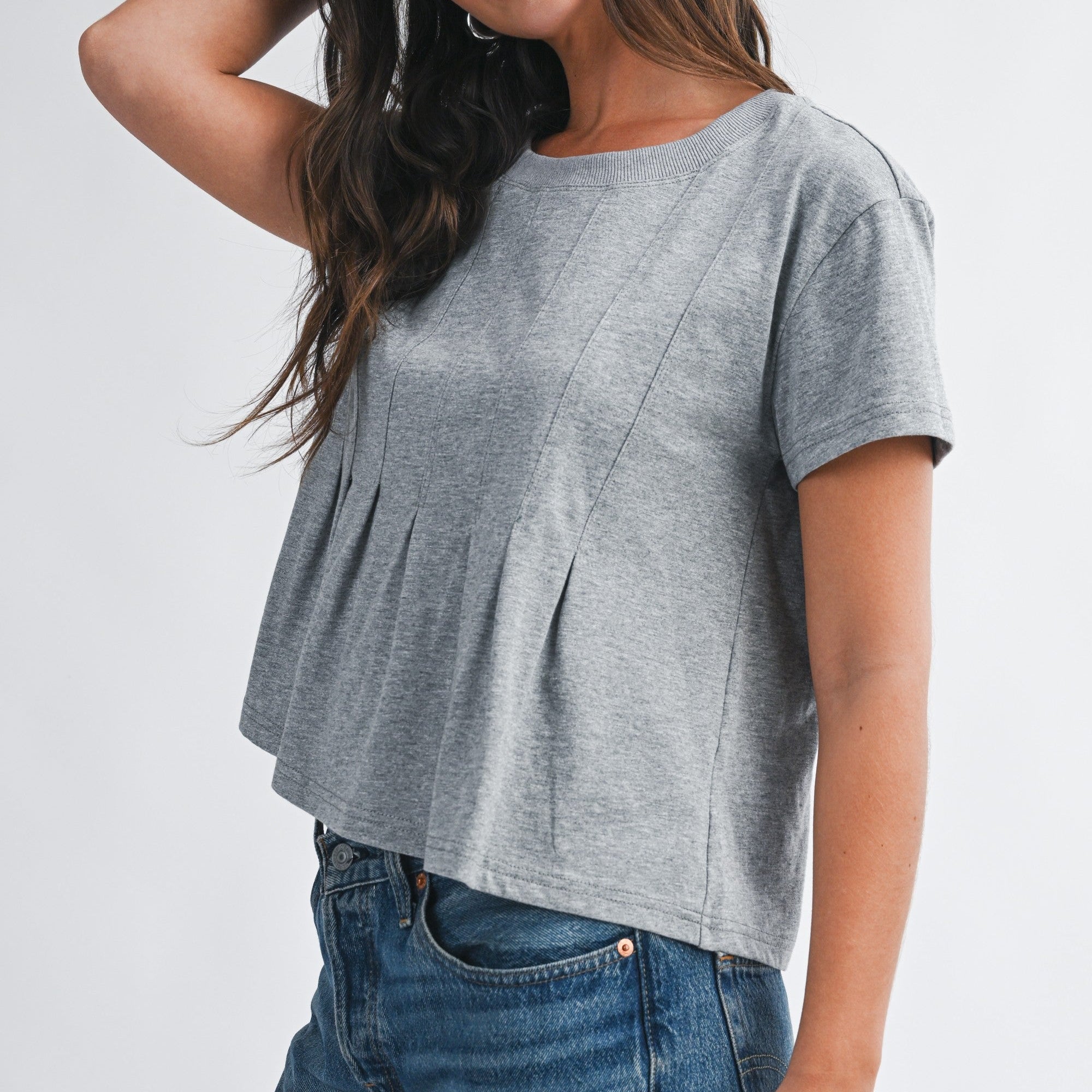 The Heather Grey Pleated Swing Tee Top redefines the classic tee with refined details and a flattering, feminine silhouette. Soft front pleats cascade from the neckline, creating subtle dimension and a gently flared shape that moves with you throughout your day.
