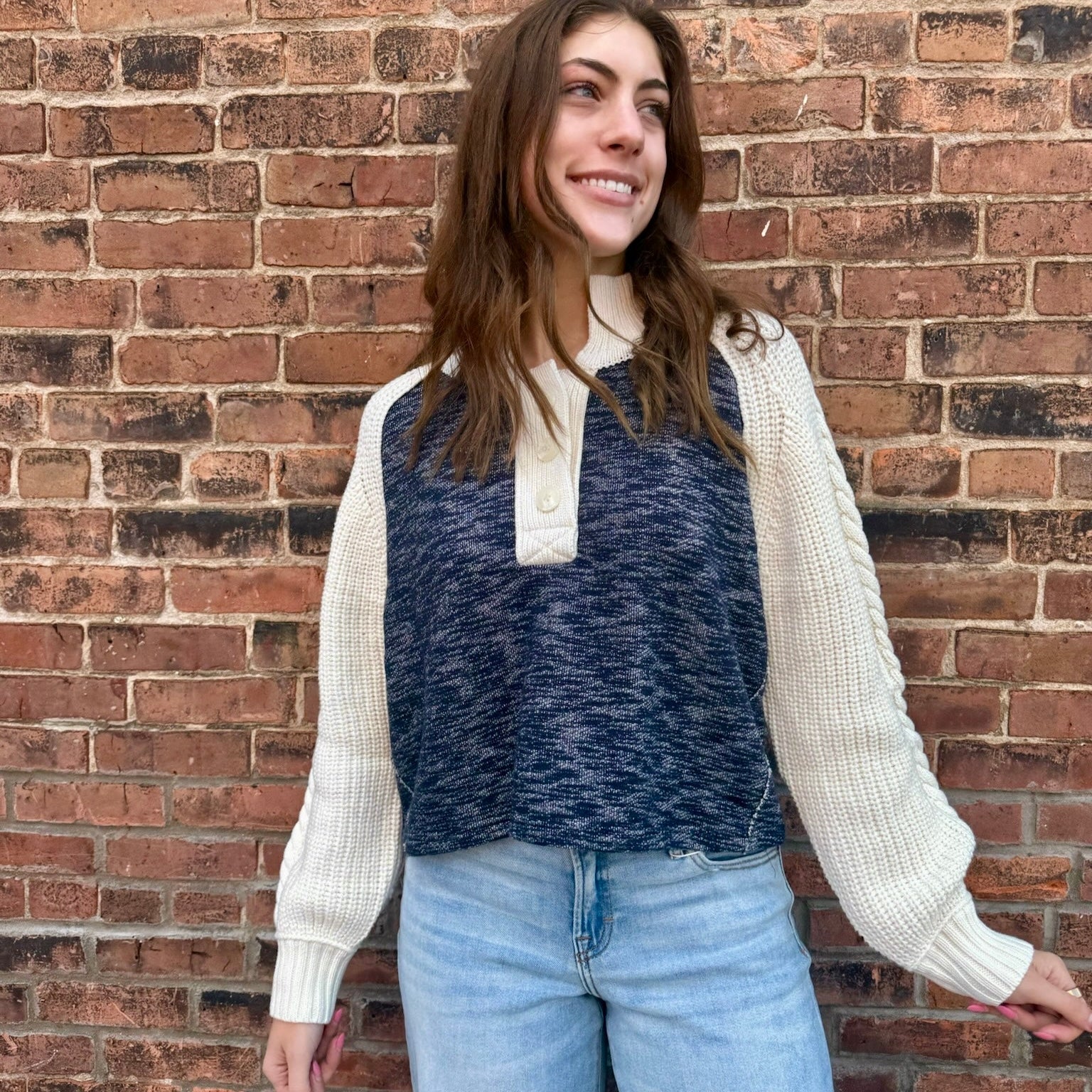 Elevated coziness meets effortless style. This cream and navy collared sweater by Vintage Havana features a textured knit with contrast sleeves and a button-front detail for a touch of polish. The relaxed fit pairs perfectly with denim or tailored trousers, making it your go-to for casual days that still call for a put-together look. Cozy enough for chilly mornings, chic enough for coffee dates. 55% Cotton, 18% Acrylic, 17% Polyester, 9% Rayon. Machine wash cold, line dry.