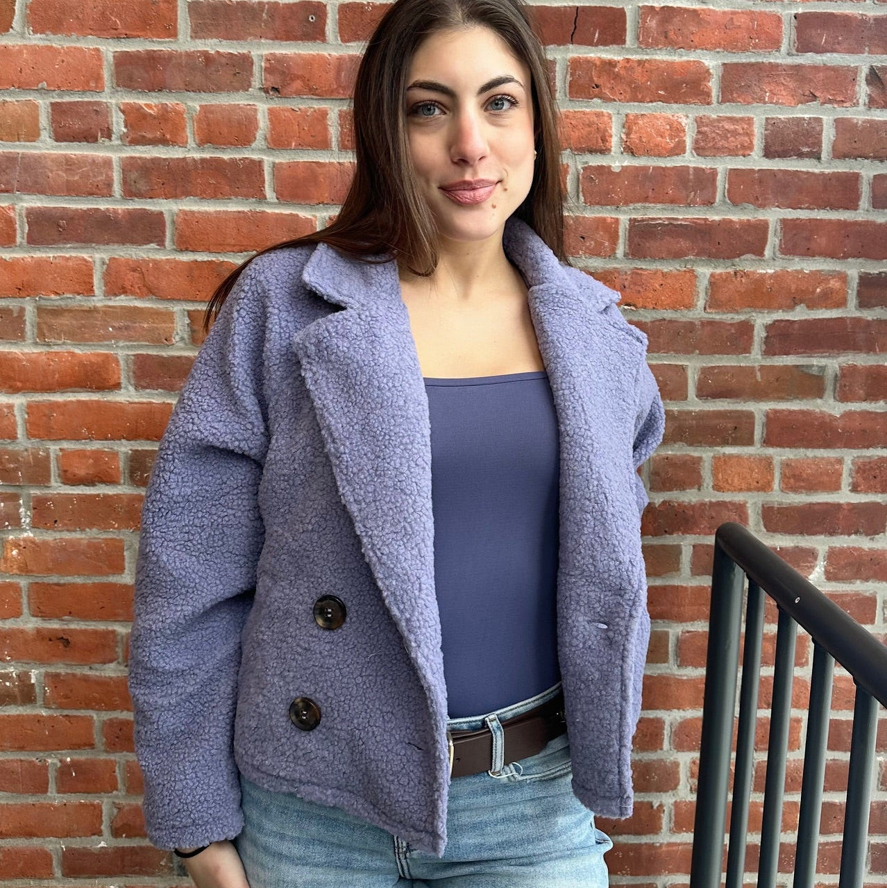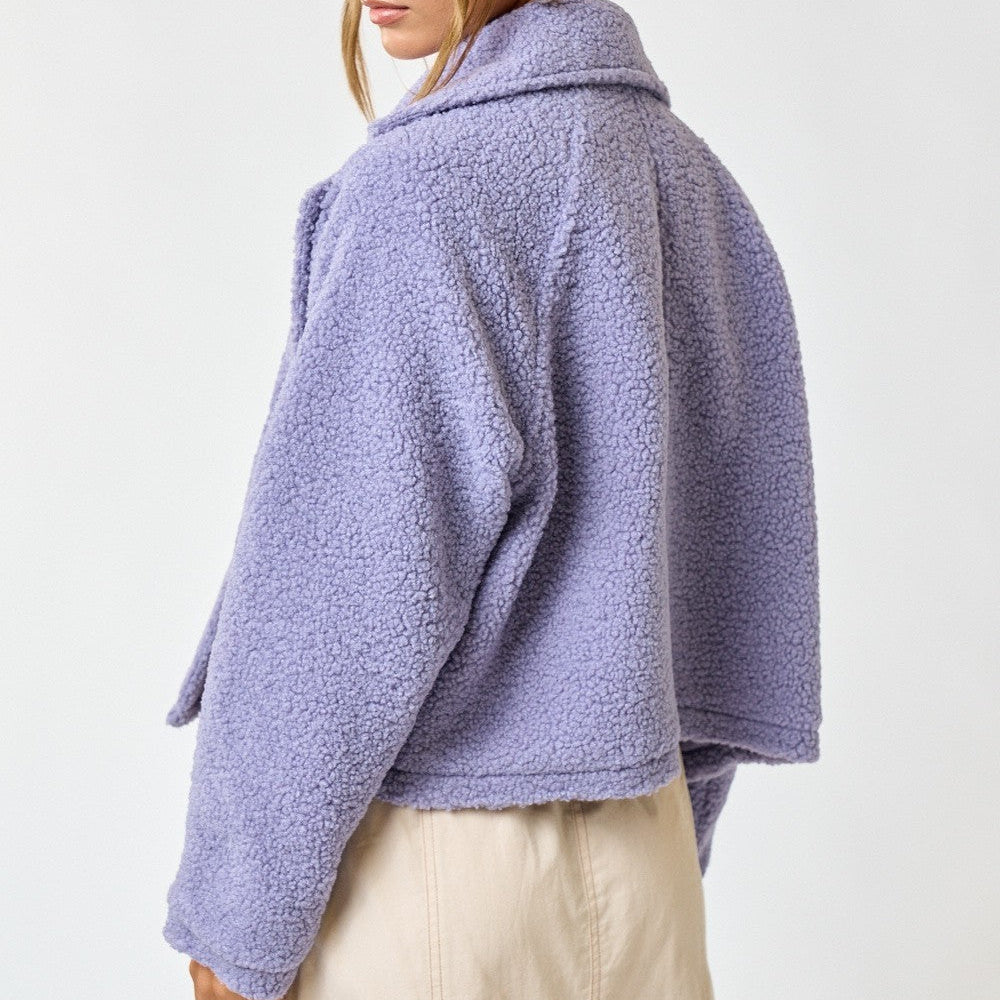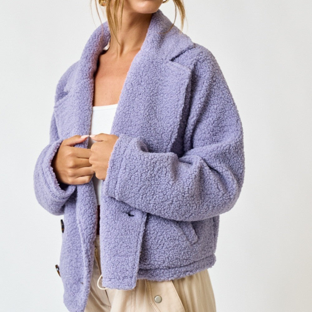 Sherpa Double Button Collared Jacket. This cozy yet chic jacket is crafted from soft sherpa fabric, offering ultimate comfort for colder months. The double button closure adds a touch of classic style, while the side pockets provide both convenience and functionality. The collared design enhances its structured look, making it a versatile piece for layering over casual outfits or dressing up for a more refined look. Perfect for chilly days, this jacket is a must-have addition to your fall and winter wardrobe.