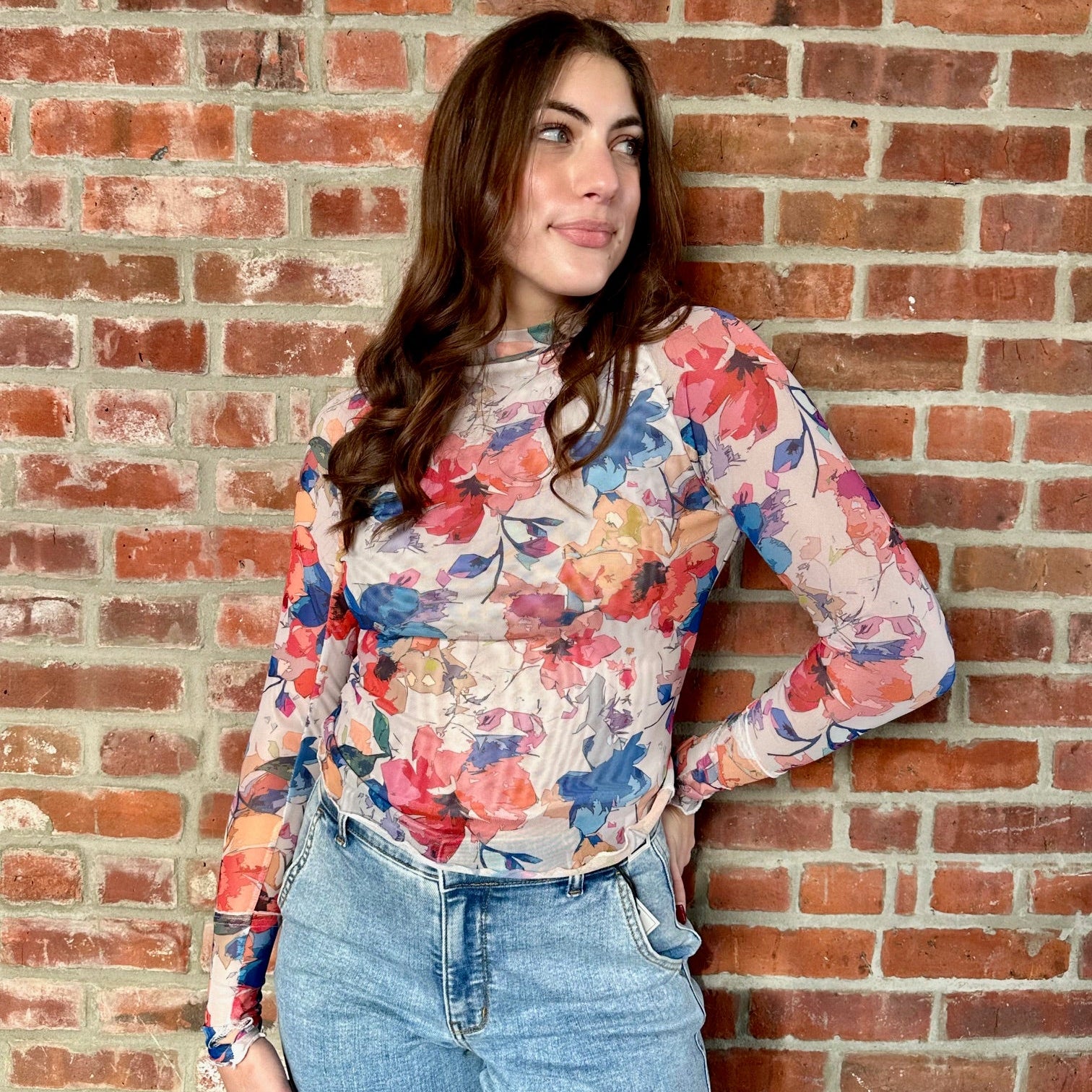 Make a bold statement with this Multicolored Abstract Floral Mesh Top—a vibrant layering piece that brings artistic flair and modern edge to any outfit.