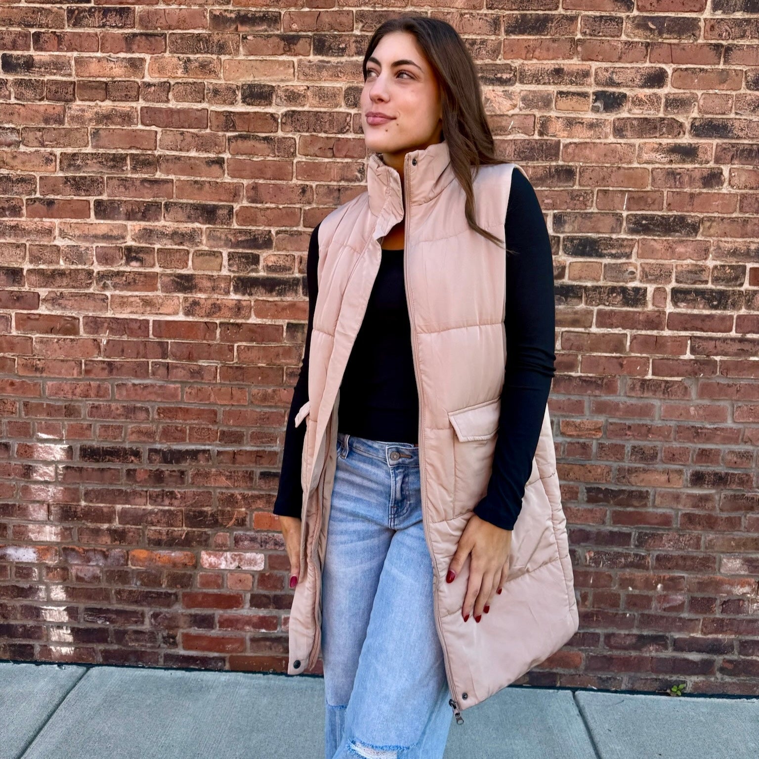 Tan Long Puffer Vest. Zipper & snap closure on the front. Two side pockets. 50% Nylon / 50% Polyester. For length reference, Emily is 5'8"